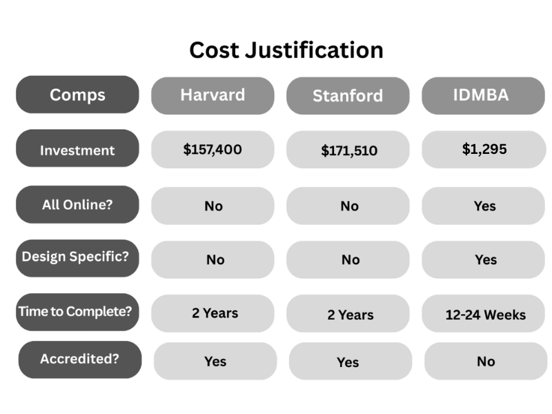 To offer an accredited program, we would have to teach you endless subjects that are of no value to an interior design professional. For example, the Harvard and Stanford MBA programs have required courses in such fields as Big Data, Global Management, Derivatives, Six Sigma, and Tax Accounting! The IDMBA strips all that out and focuses only on what matters to YOU!Â